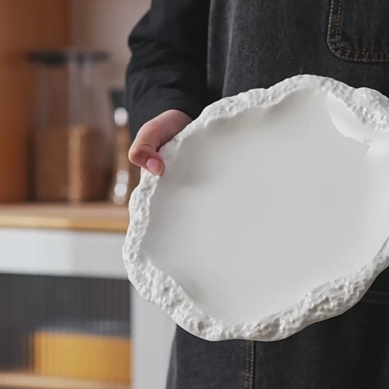 Inspired by natural rock formations, this stone-textured ceramic plate is crafted from high-quality porcelain and shaped into an organic, irregular silhouette with softly ruffled edges. The sculpted body is finished with a refined color glaze, then fired at high temperatures to reveal rich depth and layered texture.